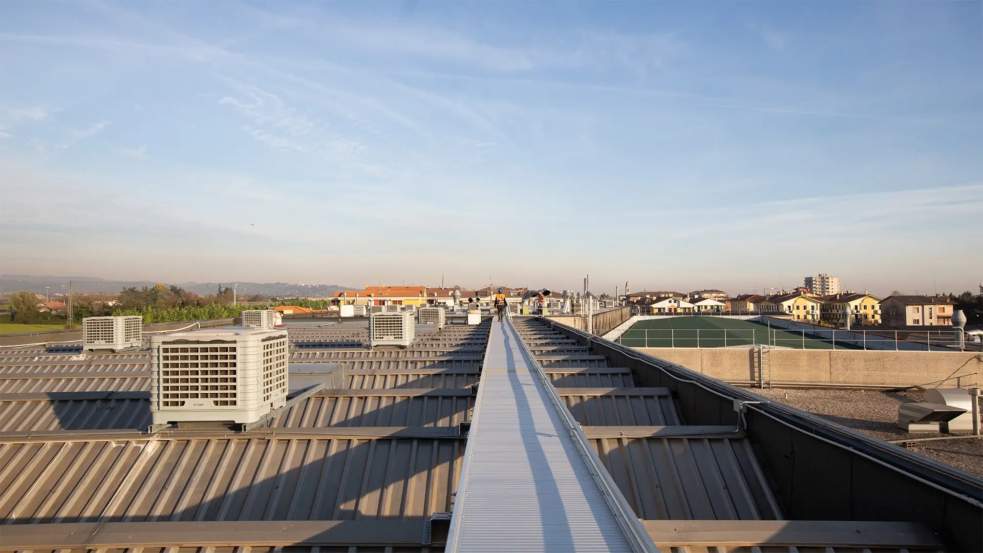 I sistemi di accesso e protezione anticaduta fissi per coperture sono soluzioni permanenti ed essenziali per garantire la sicurezza dei lavoratori in quota. Lazzaroni progetta e installa una gamma completa di sistemi, che vanno dalle scale a gabbia e quelle con binario integrato per un accesso verticale sicuro.